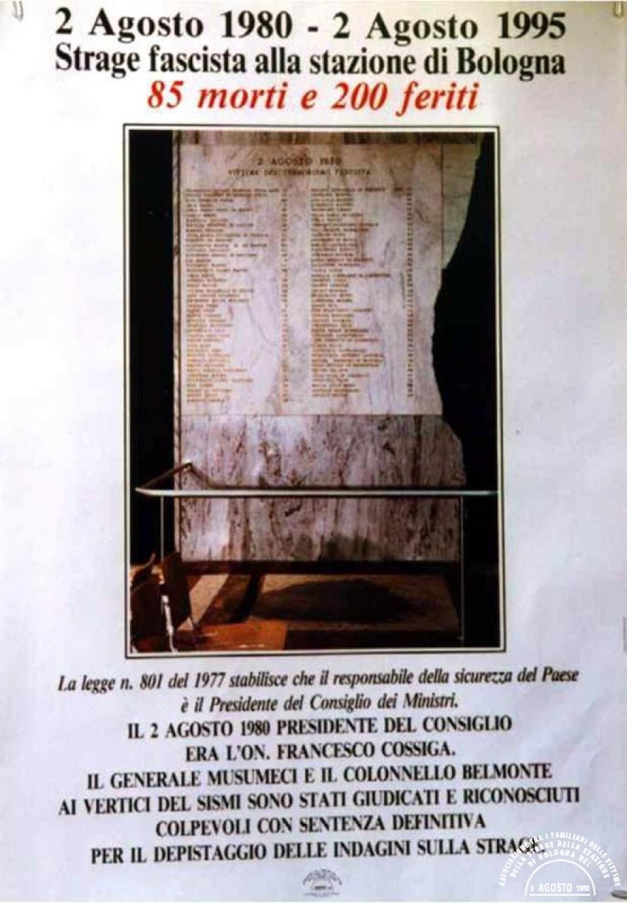 La legge n. 801 del 1977 stabilisce che il responsabile della sicurezza del Paese รจ il Presidente del Consiglio dei Ministri. Il 2 Agosto 1980 Il Presidente del Consiglio era l'on. Francesco Cossiga. Il generale Musumeci e il Colonnello Belmonte ai vertici del SISMI sono stati giudicati e riconosciuti colpevoli con sentenza definitiva per il depistaggio delle indagini sulla strage