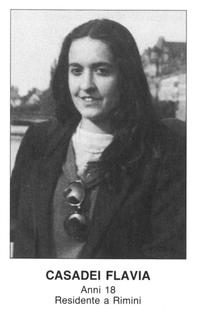Flavia, diciotto anni compiuti da poco, frequentava la quarta liceo scientifico a Rimini: aveva ottenuto la borsa di studio ogni anno fin dalle elementari. Quel sabato due agosto stava viaggiando verso Brescia dove l'aspettava uno zio.
